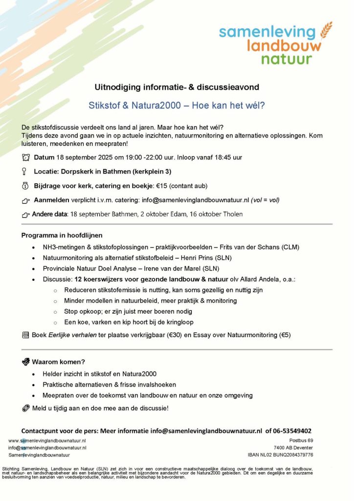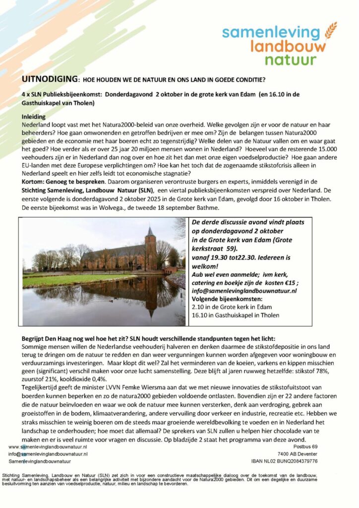 UITNODIGING: 4 x SLN Publieksbijeenkomst: Donderdagavond 18 september inde Dorpskerk van Bathmen, 2.10 Edam, 16.10 Tholen